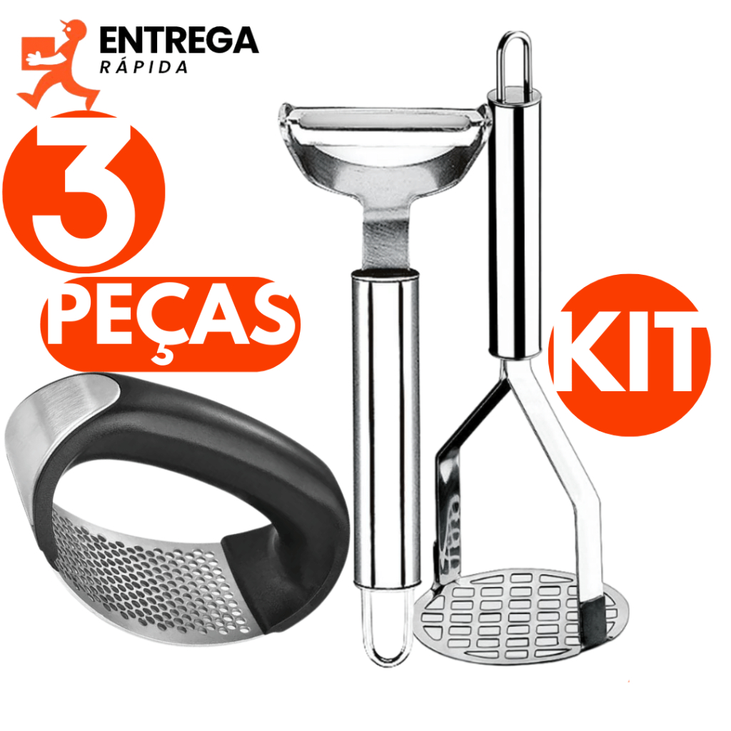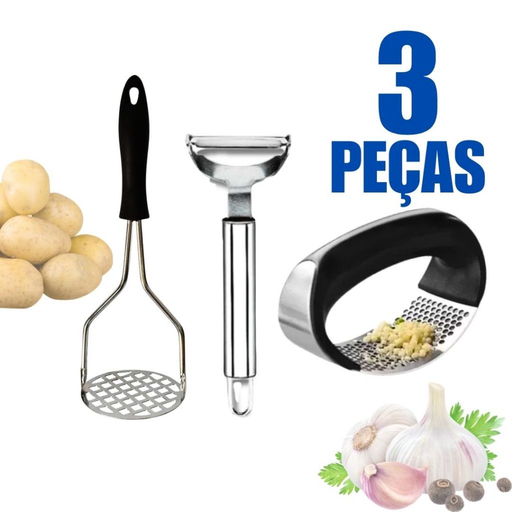Kit Peças Descascador de Legumes 3 em 1 Amassador de Batata Inox com Cabo Plástico Espremedor de Alho Inox com Plástico