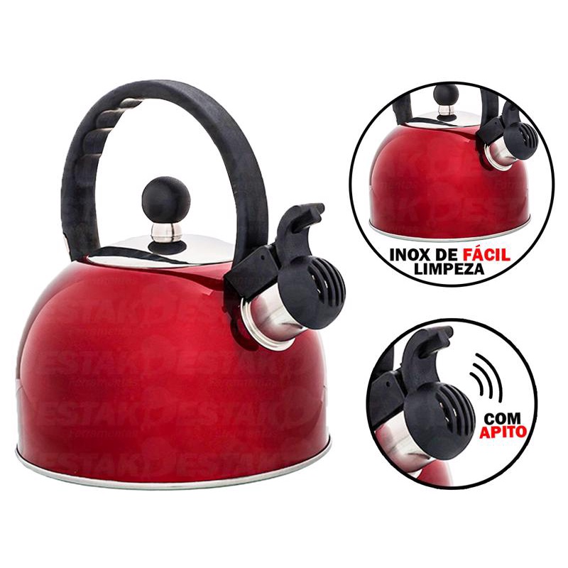 Chaleira Bule De Aço inox Com Apito 2 Litros Com tampa Vermelho Hauskraft