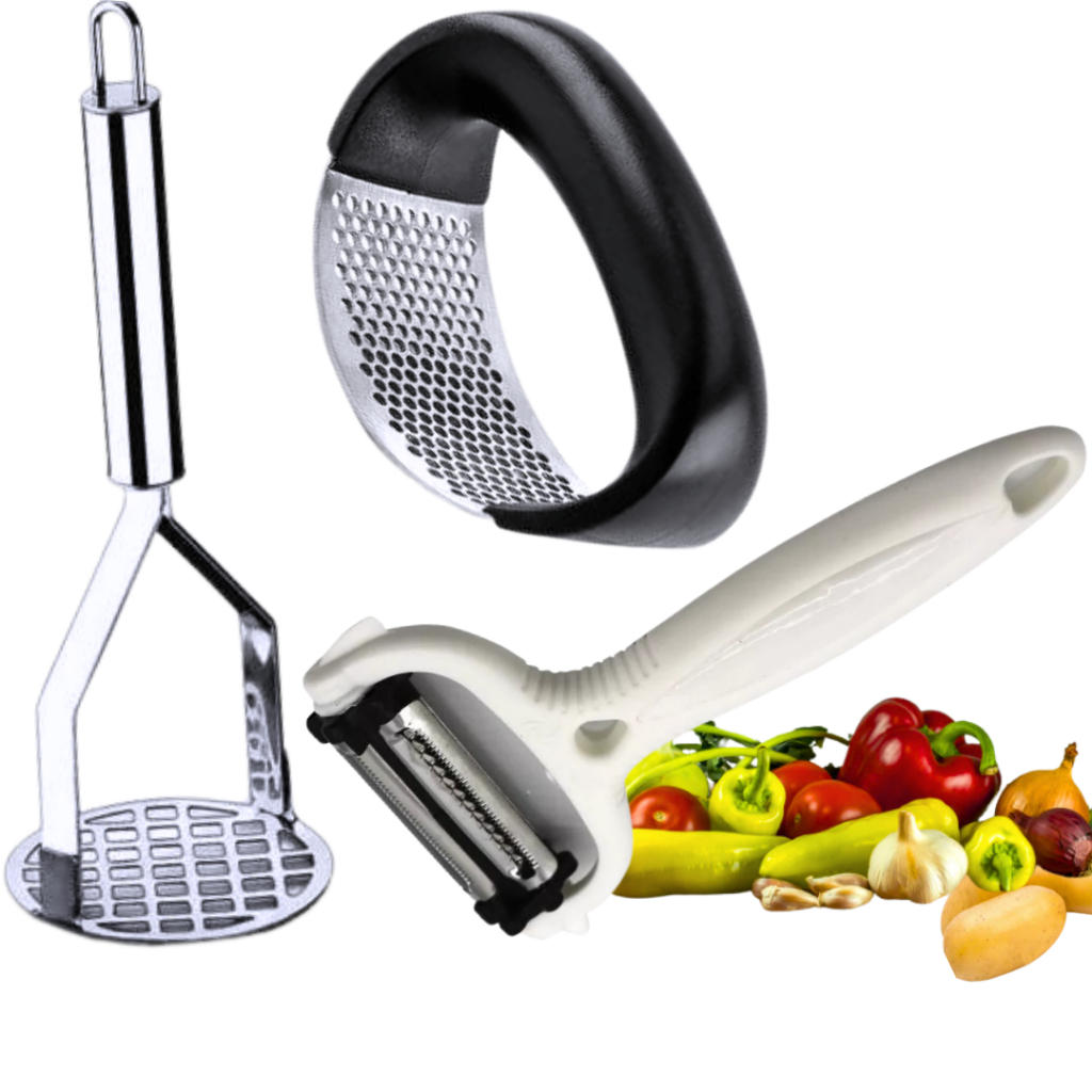 Kit 3 itens Amassador de Batata + Descascador de Legumes 3 em 1 + Amassador de Alho Multiuso Inox Utensilios para Cozinha Restaurante Cenoura Batata Beterraba