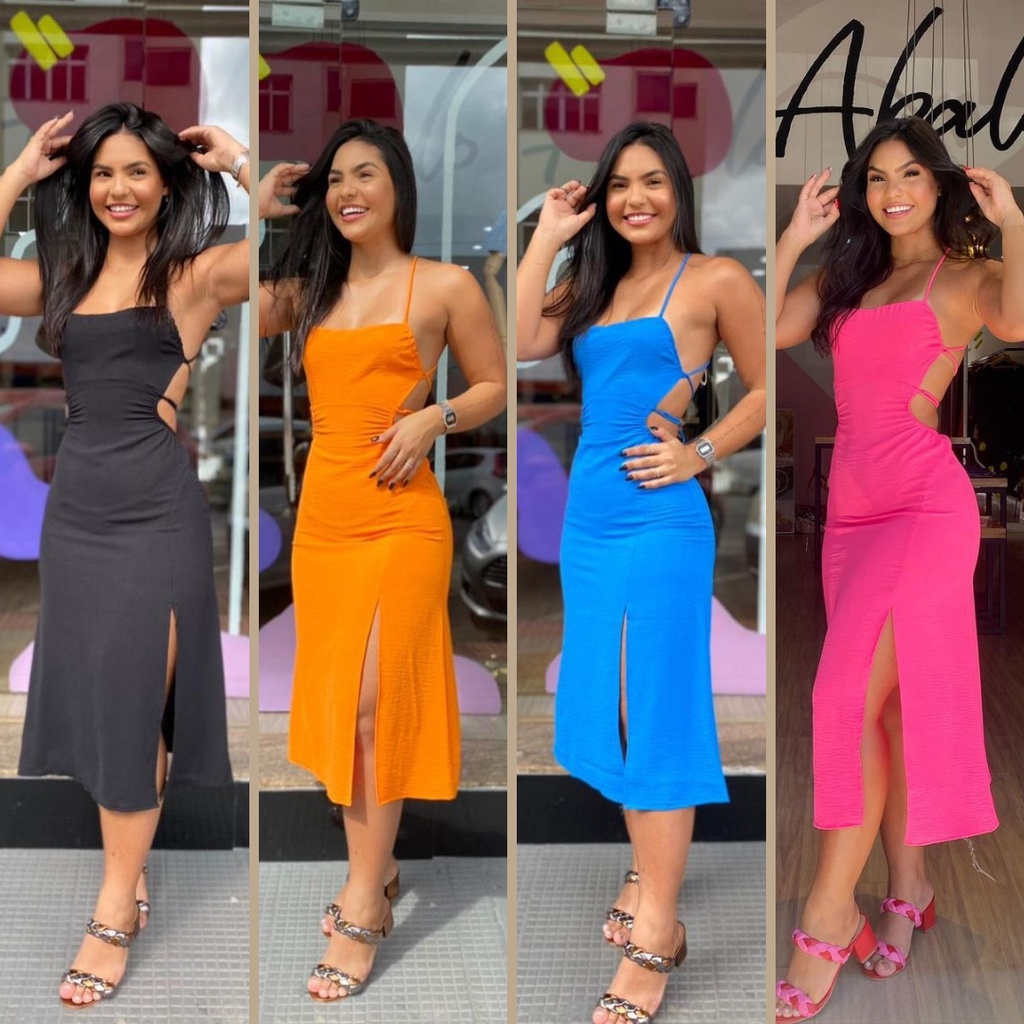 Vestido Feminino Midi Viscolinho com fenda amarração nas costas forrado com bojo e elástico moda vestidos roupas