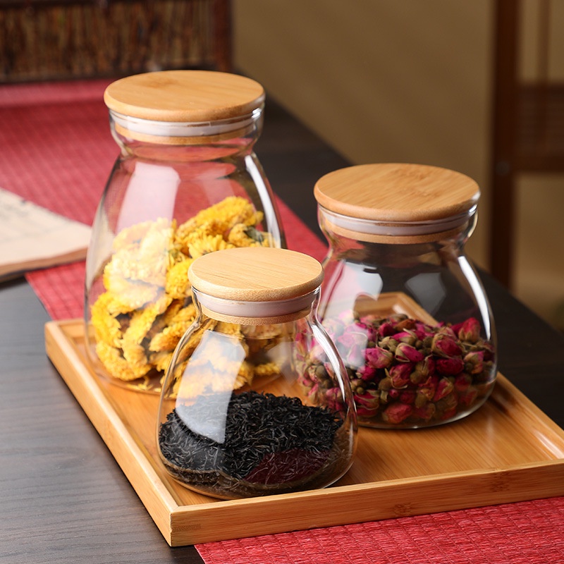 Kit com 3 Potes de Vidro Com Tampa De Bambu 500, 750 e 1.100 ml Porta Mantimento Hermético