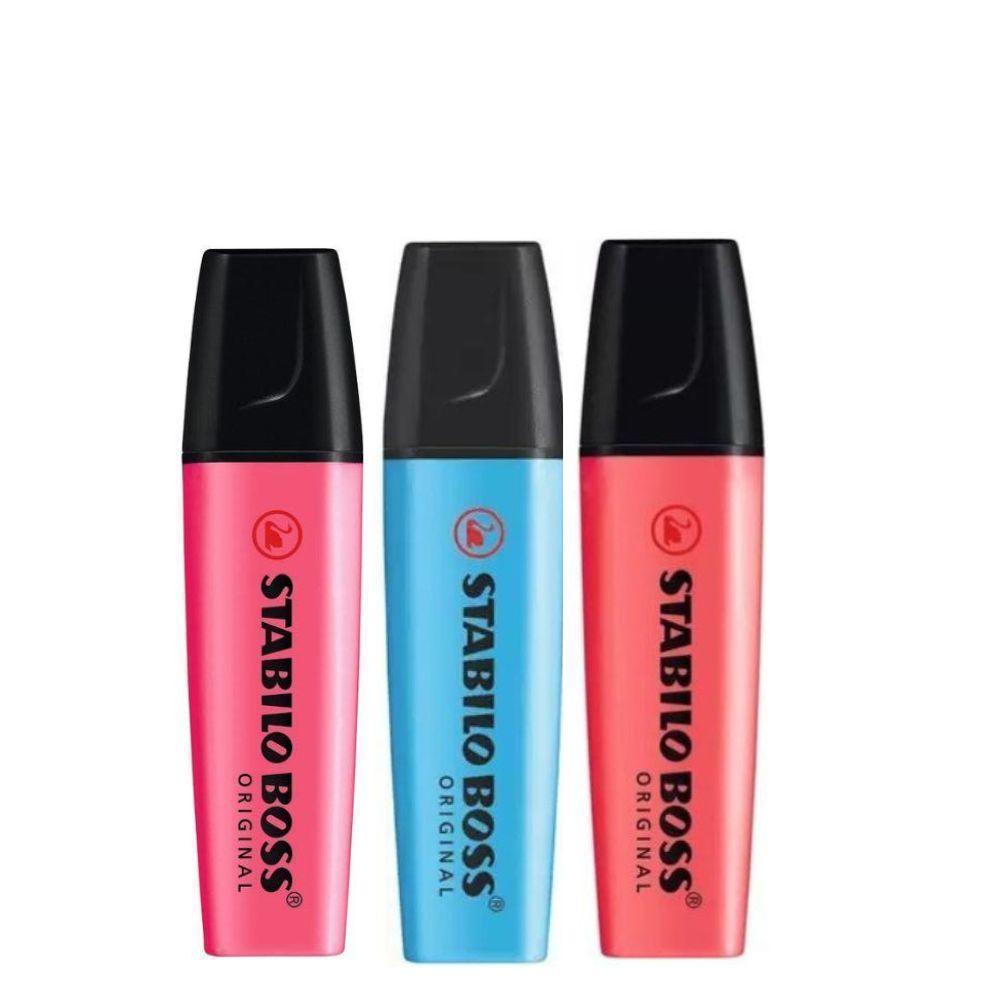 Kit Caneta Marca Texto Stabilo Boss Rosa Azul Neon e Vermelho 3 Cores