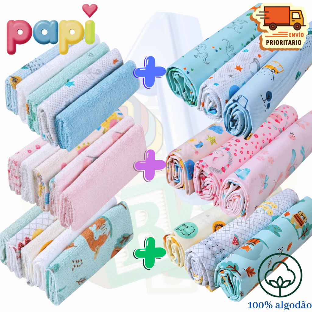 Kit Bebe Infantil 14 Peças 6 Paninho de Boca 5 Fralda de Pano 3 Cueiro Flanelado 100% Algodão Enxoval de Bebê