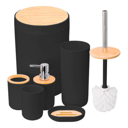 Kit Acessórios para Banheiro Conjunto 6 Peças Lavabo Utensílios Design Moderno Plástico C/ Bambu Ecológico Lixeira Saboneteira Suporte Escova de Dentes