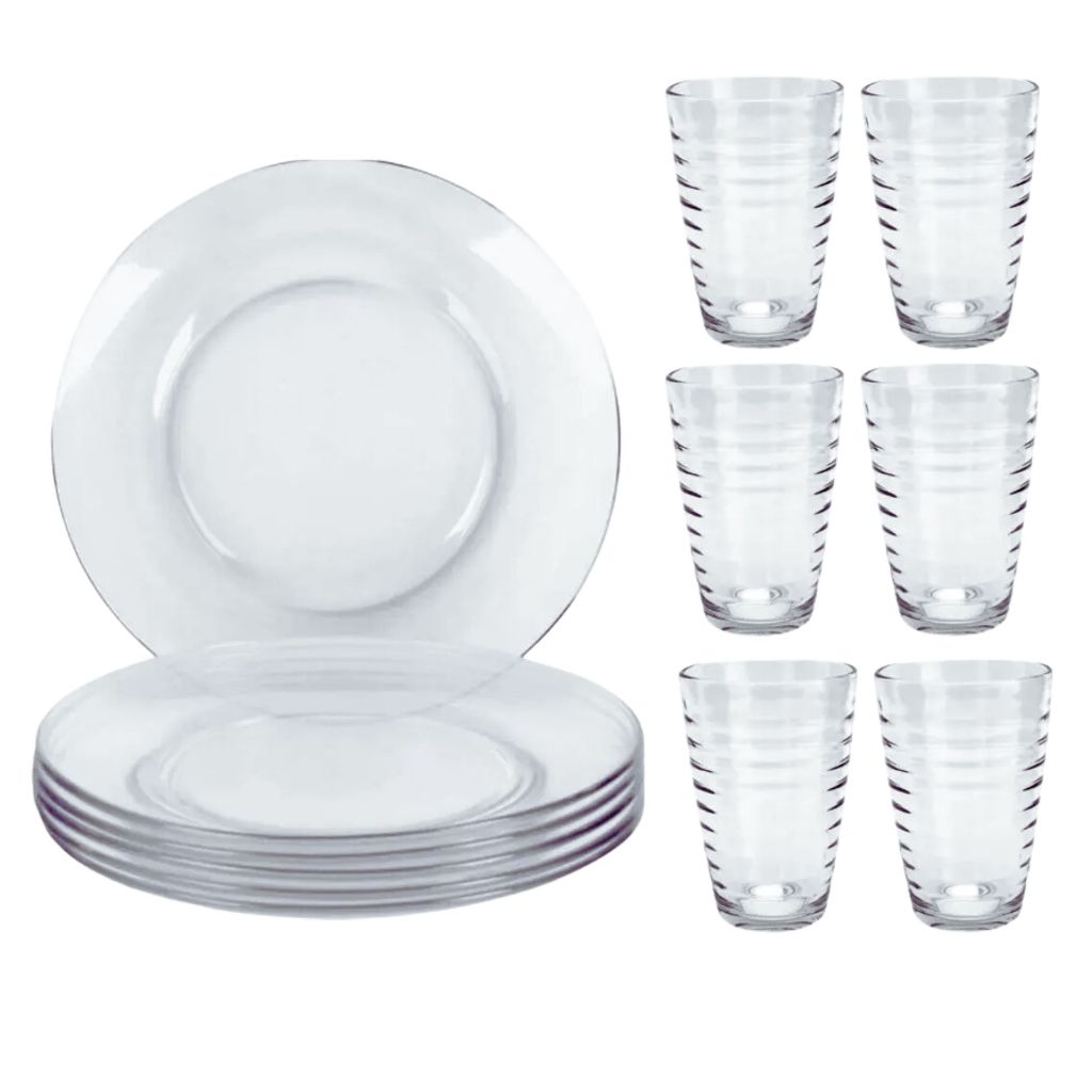 Jogo de Pratos Fundos e Copos de Vidro Arizona 200ml Kit com 8, 12 ou 24 Unidades