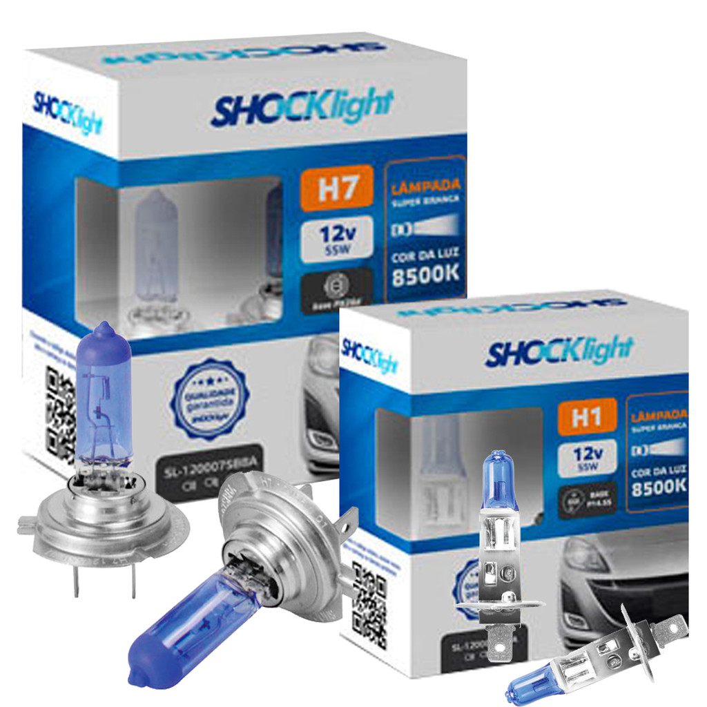 Kit Lampada Farol Alto Baixo H1 H7 Shocklight 8.500 K Selo Inmetro Foco Duplo