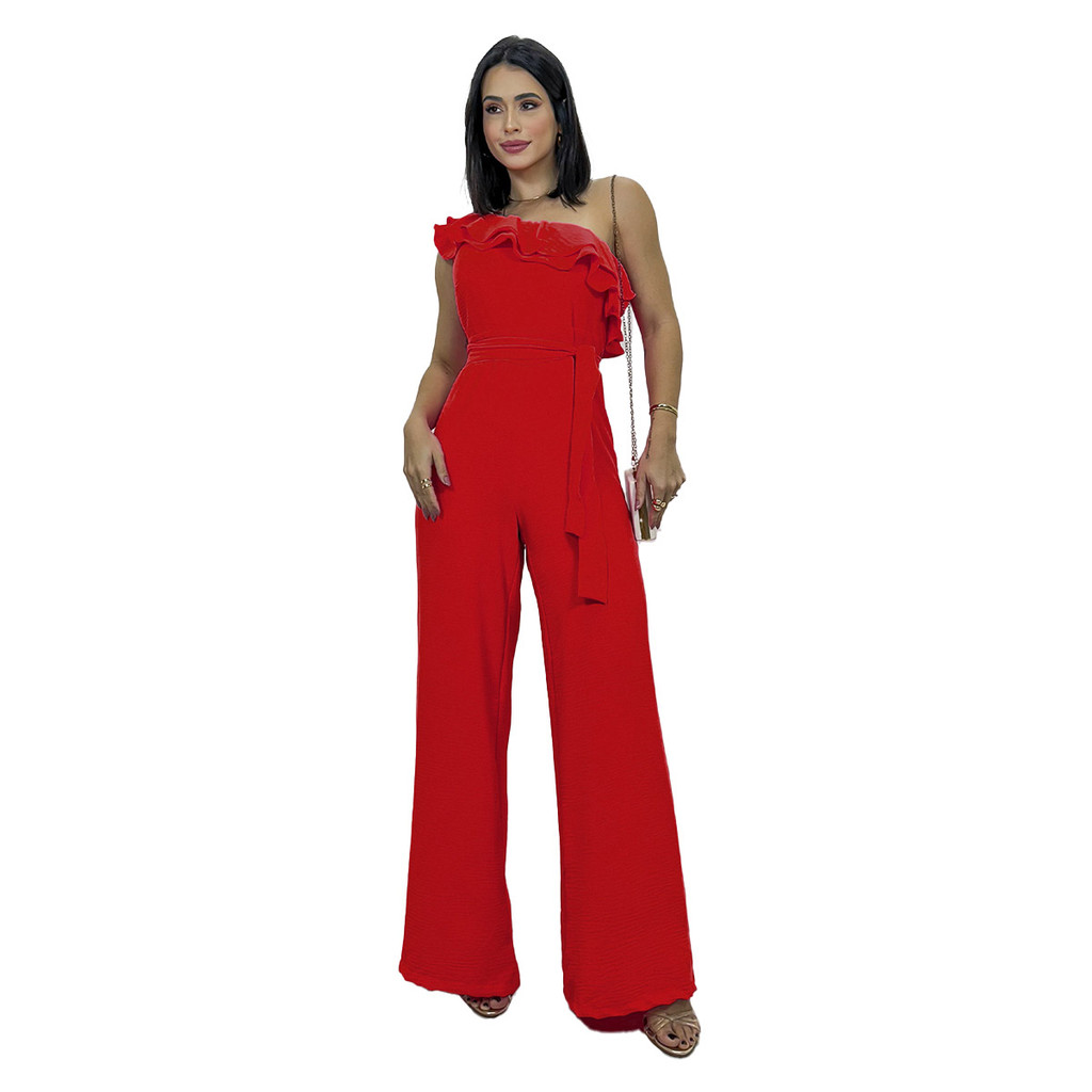 Macacão Pantalona Um Ombro Só Babado Acinturado Social