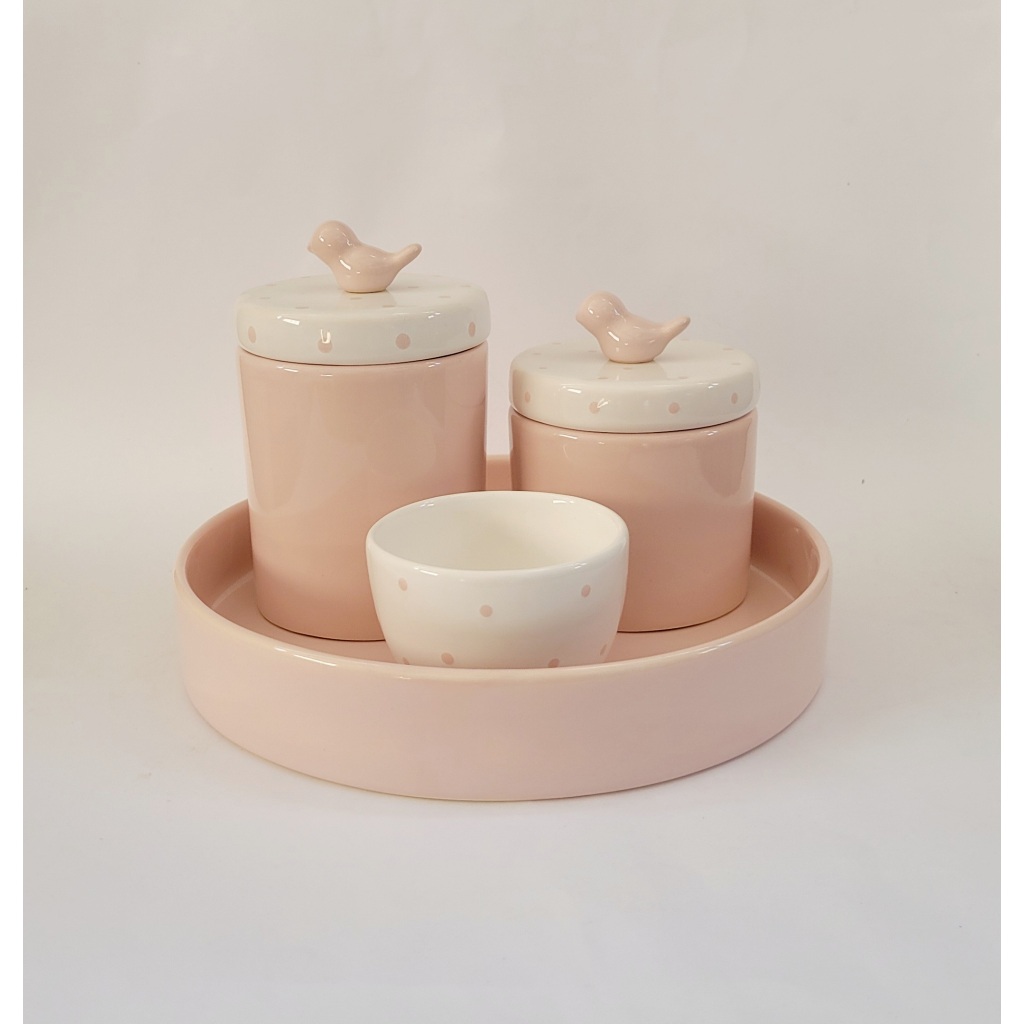 Kit Higiene Bebe Porcelana Rosa Velho Tampas Poa Puxador Passarinho Band Redonda 06 Pçs