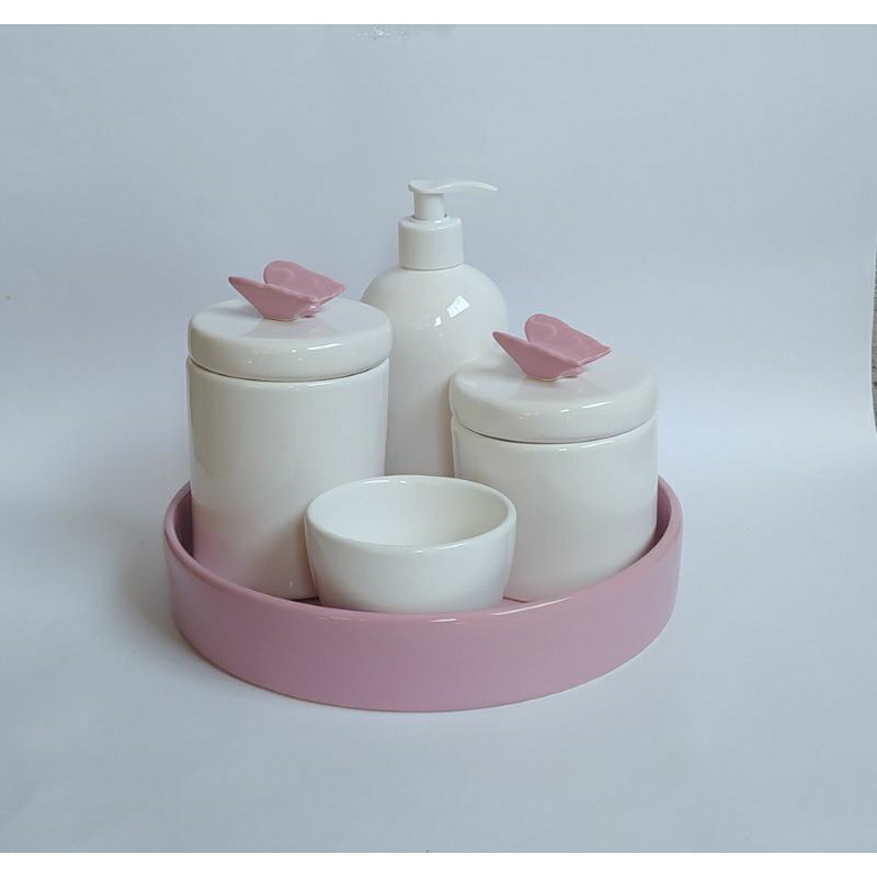 KIT HIGIENE BEBÊ PORCELANA BRANCO FLORAL BORBOLETA CACHEPÔ BANDEJA REDONDA LOUÇA ROSA