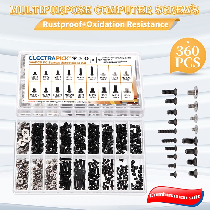 ELECTRAPICK 360 Pcs M2 M2.5 M3 Kit De Parafusos Para Notebook De Cabeça Plana Com Chave De Fenda Dell Samsung Sony IBM HP Lenovo (Black Silvery)