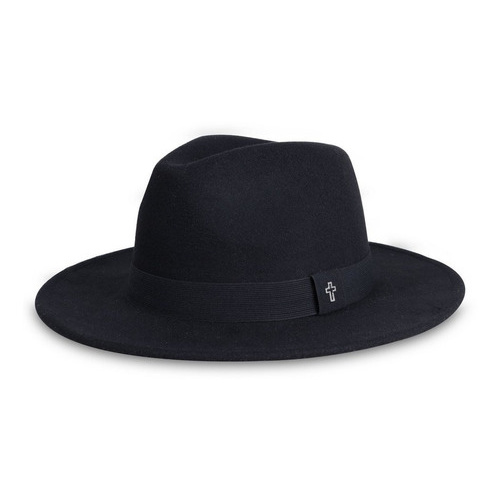 Chapéu Fedora Preto Aba Reta 7cm Cruz Prata