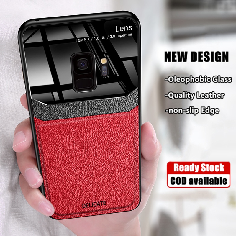 Para Samsung Galaxy S9 S9 + Plus Slim Minimalista Caixa De Couro De Vidro Oleofóbico Com Tampa Traseira De Borracha De Silicone Antiderrapante
