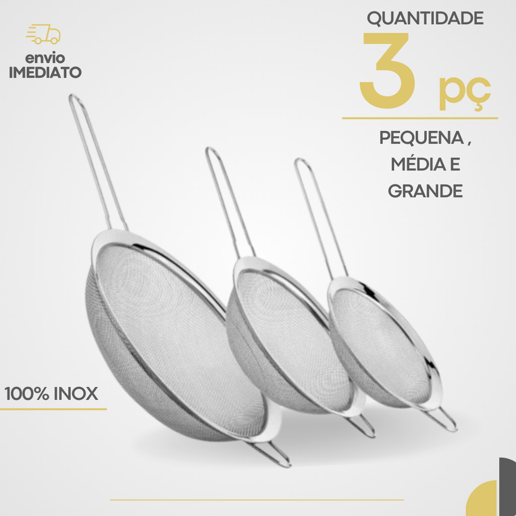 Kit 03 Peneira Coador Manual Em Aço Inox 3 Tamanhos P - M - G