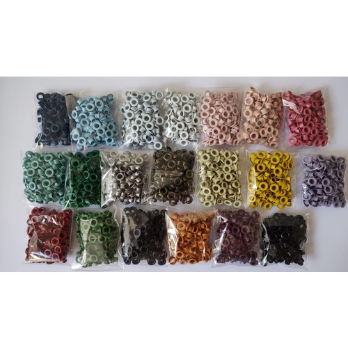 Kit ilhós alumínio n°54 com 15 cores para artesanato aplicação feita com crop e alicate.