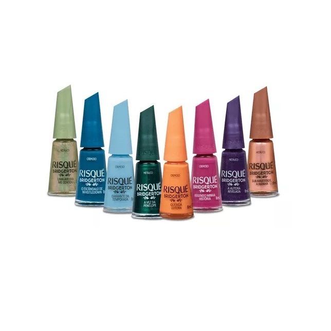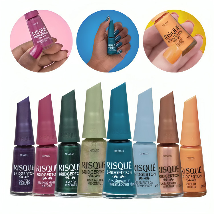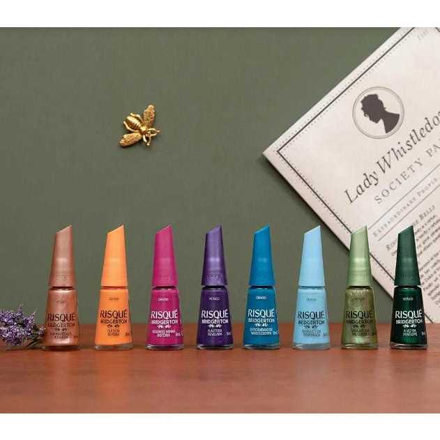 Kit Esmalte Risqué Bridgerton Coleção com 8 cores - Querida Leitora, A Autora Revelada, Diamante da Temporada, Sua Majestade, a Rainha, Uma Abelha me Contou, A Vez da Penélope, Regendo Minha História e Escândalo de Whistledown. Lançamento
