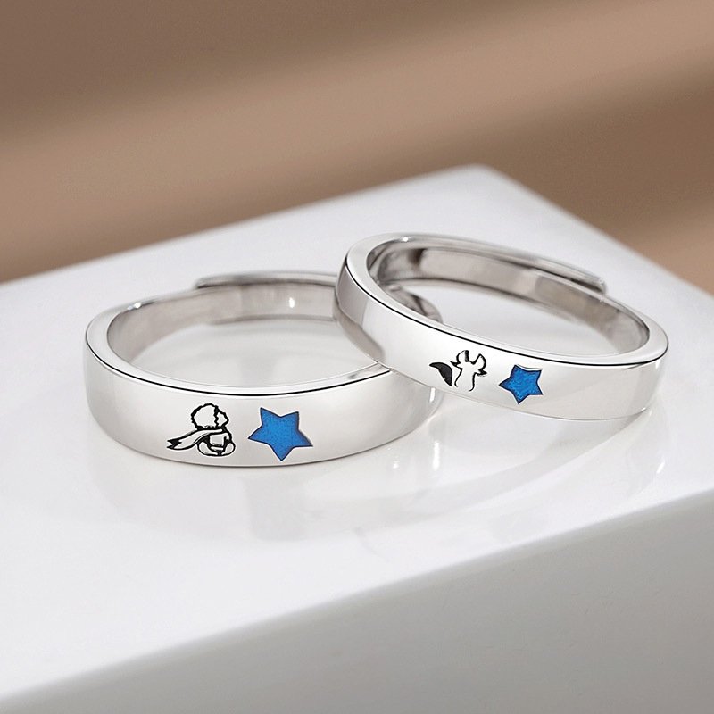 S925 Silver Cute Little Prince e Fox Couple Ring Abertura Ajustável Simples e Único Anel de Casal Feminino