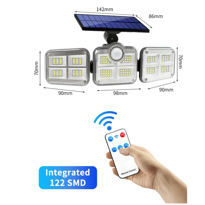 Refletor de Led Com Painel solar Três Cabeças Giratorias 122 Led Solar Luzes De Jardim Ao Ar Livre Sensor De Movimento De Segurança Controle Remoto Lâmpada De Parede À Prova D'água Com