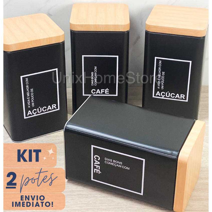 Kit 2 Latas Pote Café e Açúcar Porta Organidor de Cozinha Mantimentos Multiuso Metal Casa