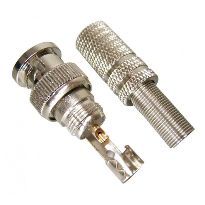 Conector BNC Macho para Solda ou Parafuso. Conector em metal e capa de proteção em plástico. Plug BNC Macho. Possui capa de proteção para o cabo.