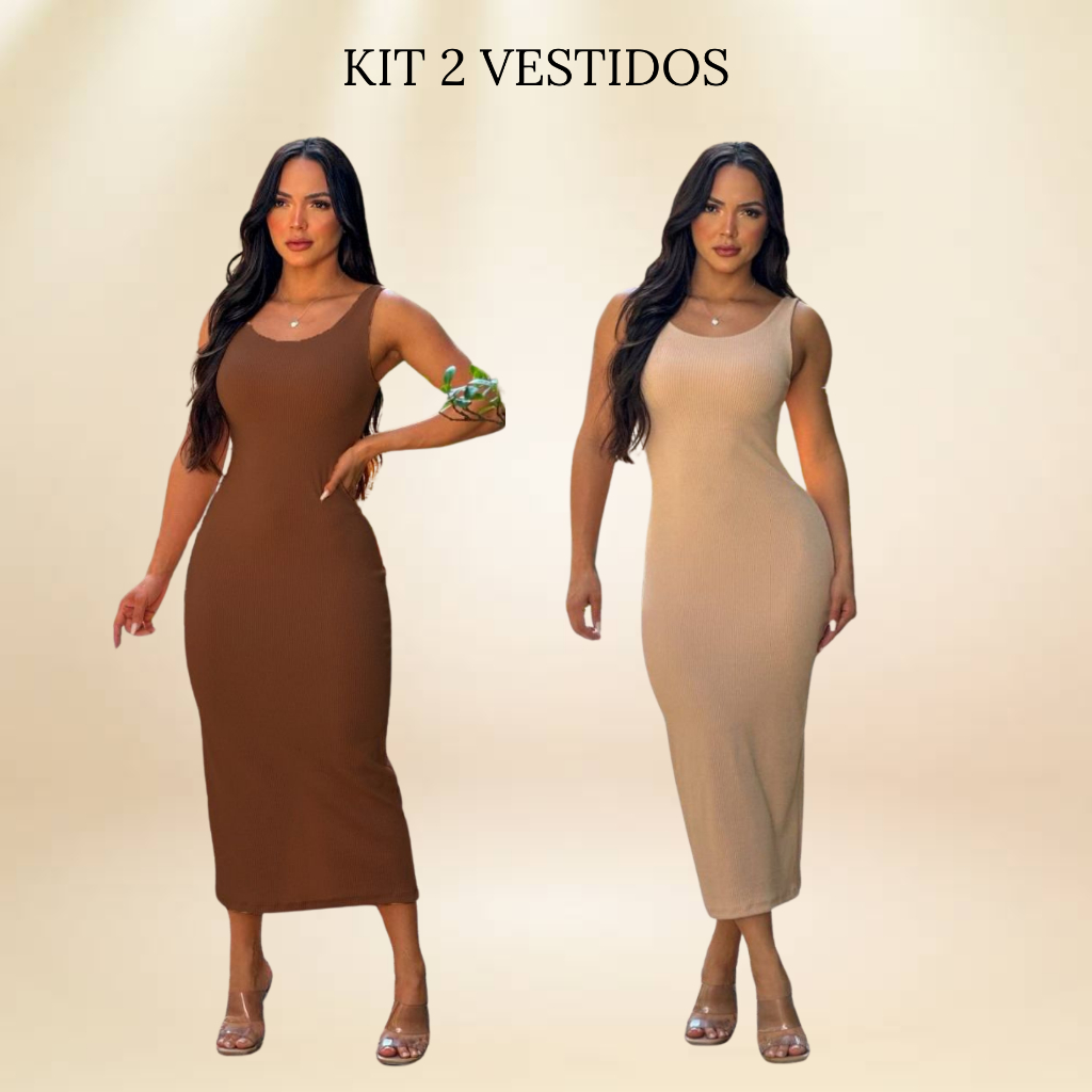 Kit 2 Vestido Feminino Colado Midi Alça Tubinho Canelado Decote Modinha Blogueira Tendência