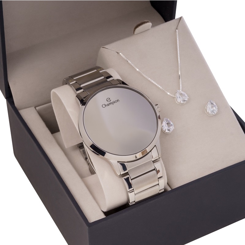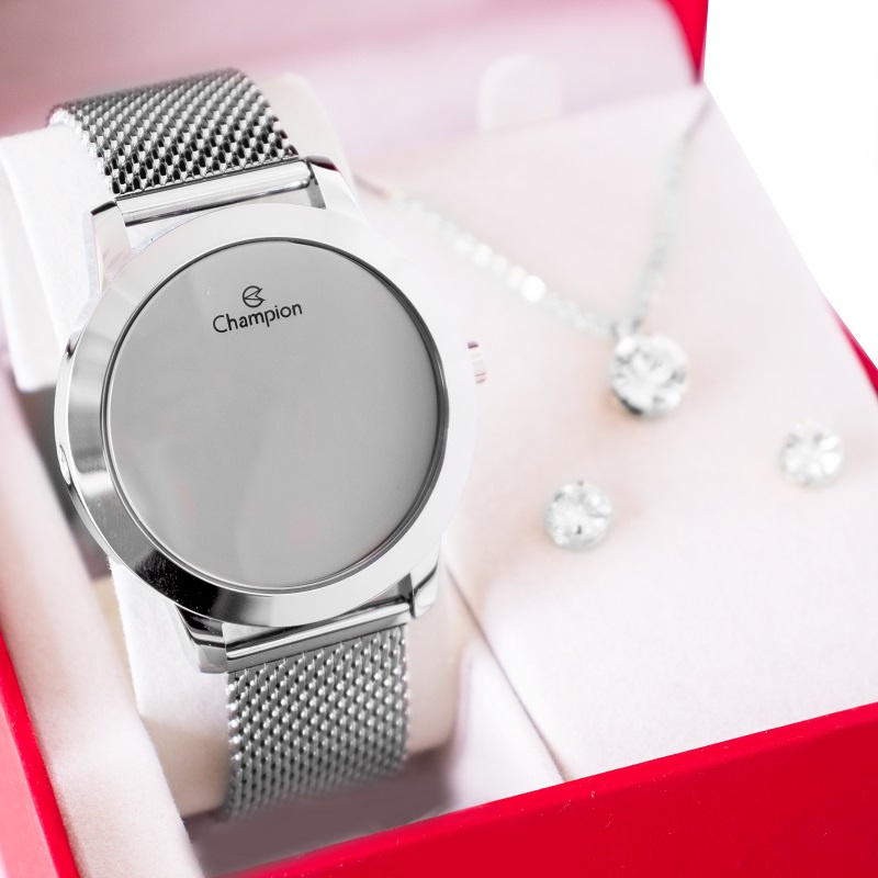 Relógio Feminino Champion Digital Espelhado Prata CH40142S Kit Colar e Brincos