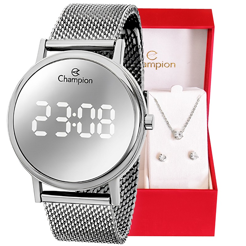Relógio Champion Feminino Digital Espelhado Pulseira Mesh + Kit Colar e Brincos Original À Prova D'Água Presente Moda Gift Aniversário Tendência Estilo Mulher Esposa Namorada Mãe Barato CH40179S