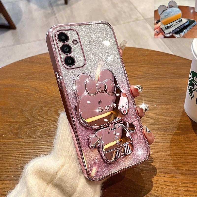 Caixa Samsung A14 4G 5G A15 A55 5G Cartoon 3D Coelho Cosmético Espelho Glitter Do Telefone Hello Kitty Caixas De Suporte Capa De Eletrodeposição A Laser + Dobra