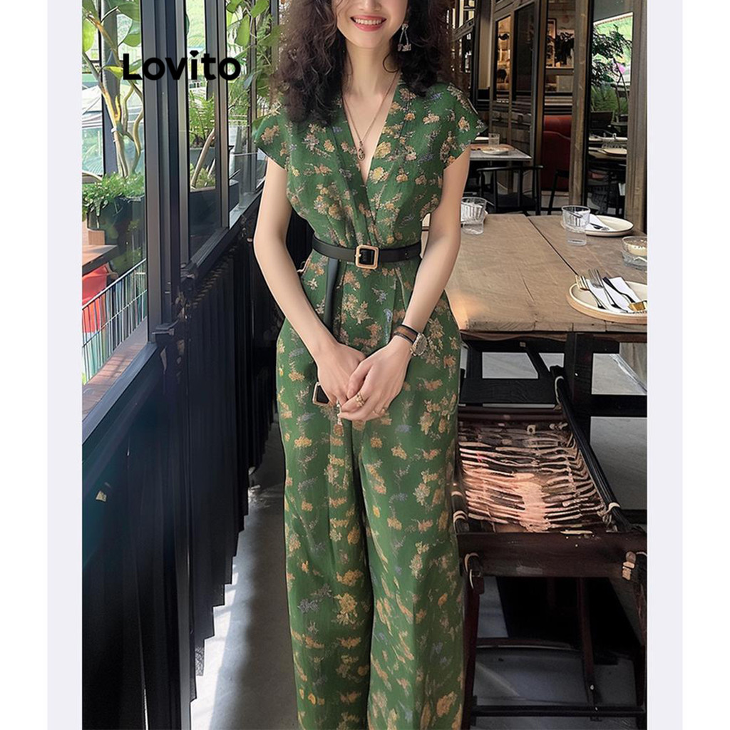 Lovito Macacão feminino casual Ditsy Floral Flowers com acabamento em alface LNE70506