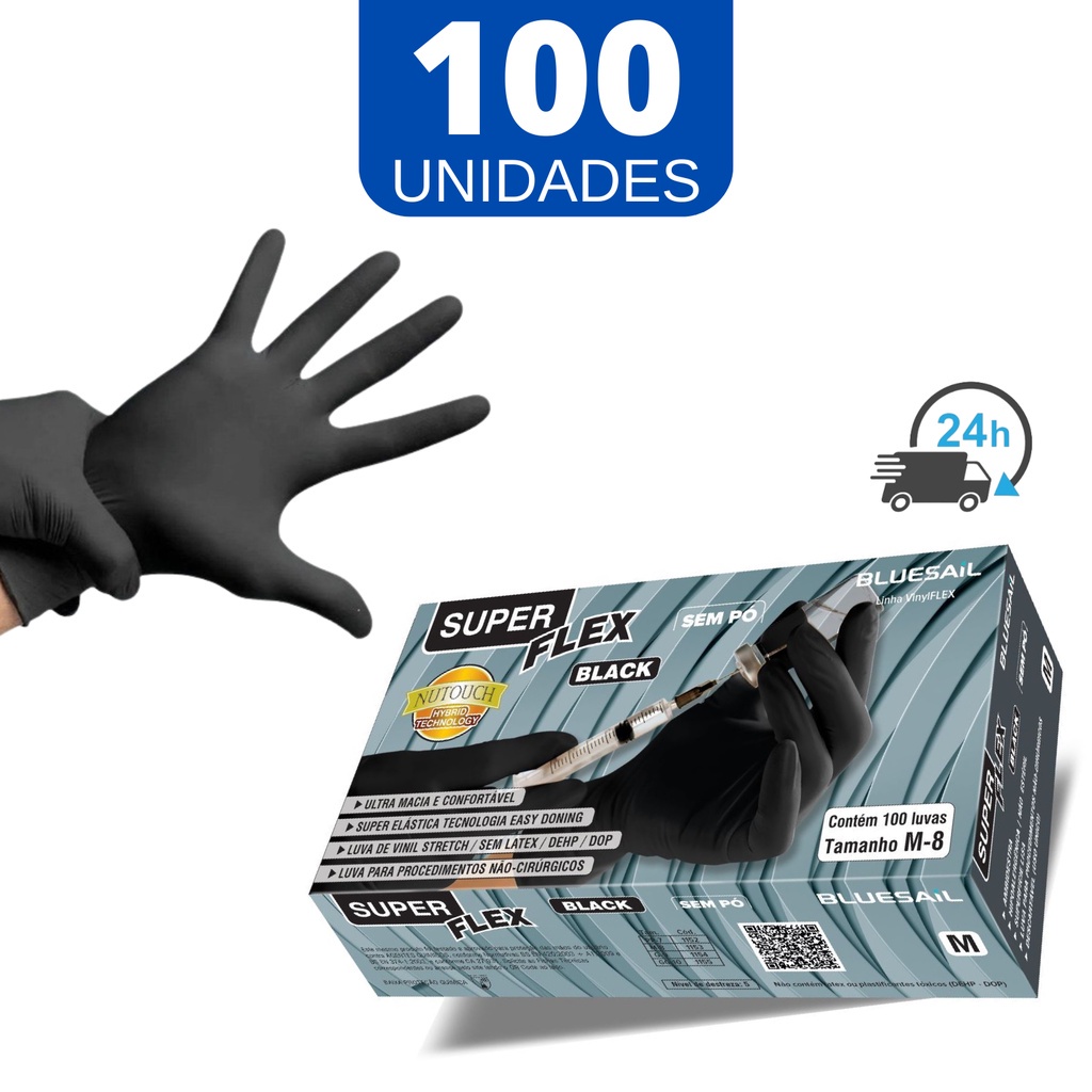 Luva Vinil Descartável Preta Procedimento Sem Pó Caixa Com 100 Unidades