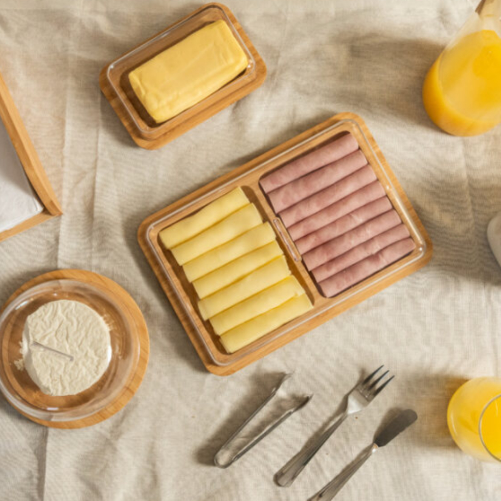 Porta Frios Duplo Tampa Bambu 2 Divisórias Queijo Presunto Acrílico