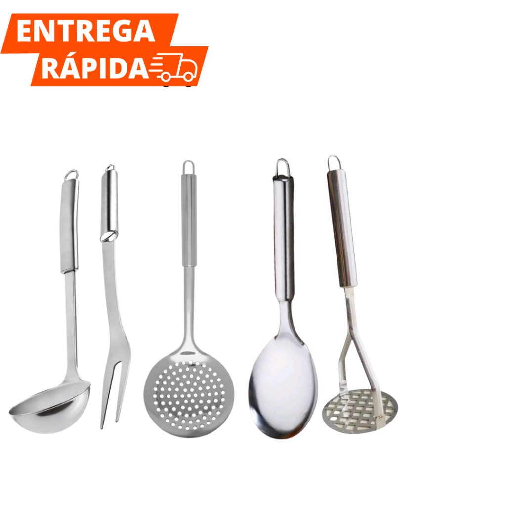 Kit Utensílio De Cozinha 5 Peças De Inox Com Colher de Arroz Concha Escumadeira de Frituras Garfo Trinchante e Amassador Batata Utensílios De Cozinha