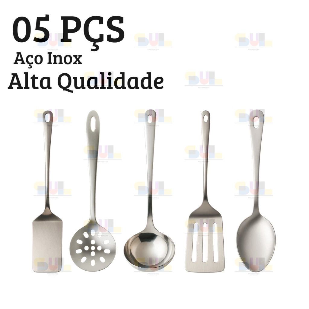 Jogo Kit Utensílios de Cozinha 4 e 5 Peças 100% Aço Inox Colher Escumadeira Concha Pegador de Massa e Garfo 2023