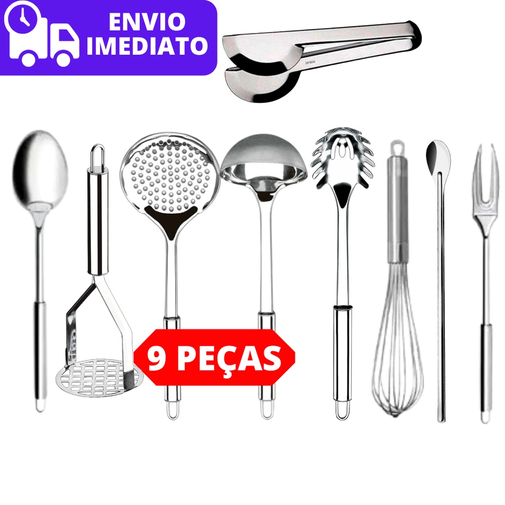 Kit Utensílios 9 Peças Aço Inox de Cozinha Concha Escumadeira Pegador Colher Garfo Fuet Pegador Colher e Amassador