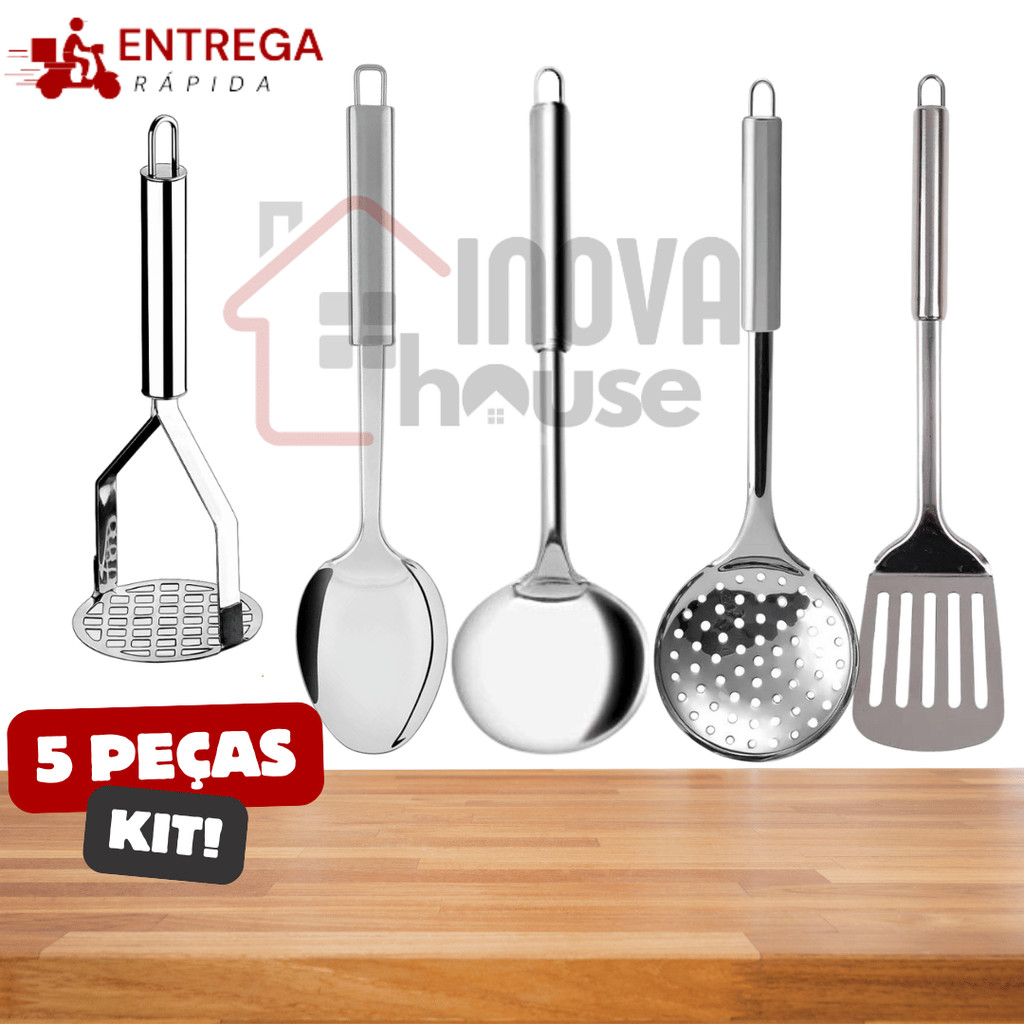 Kit 5 Peças Utensílios Inox Premium Concha + Colher + Escumadeira + Amassador de Batatas + Pegador de Salada Para Cozinha