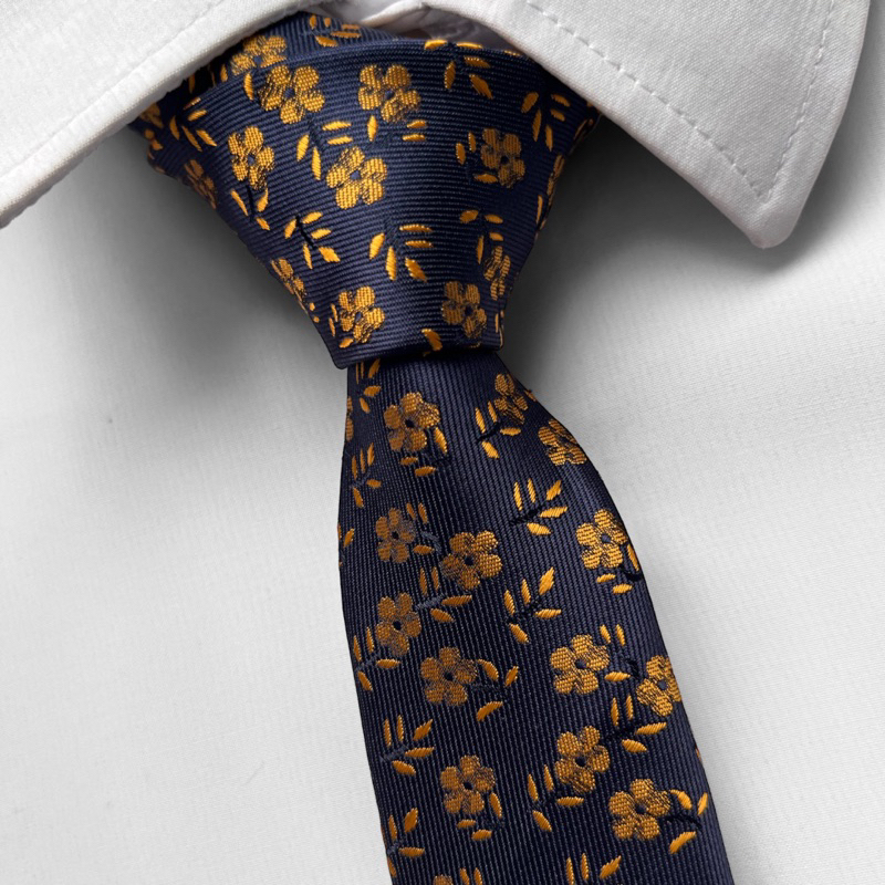 Gravata Slim Fit Floral Azul Marinho e Mostarda
