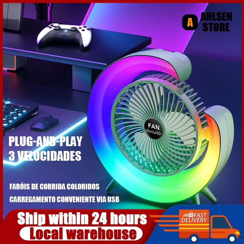 【Enviar fios de carga】 Mini Ventilador de Mesa Silencioso Portátil Colorido Led Colorida RGB Desktop Vento Fresco AHLSEN