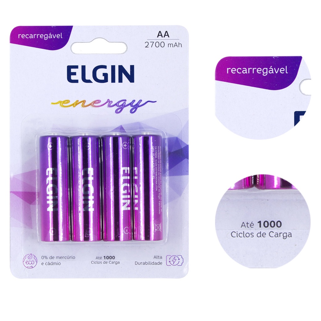 04 Pilhas Bateria Cilíndrica AA 2700mah Recarregável Elgin - 01 Cartelas