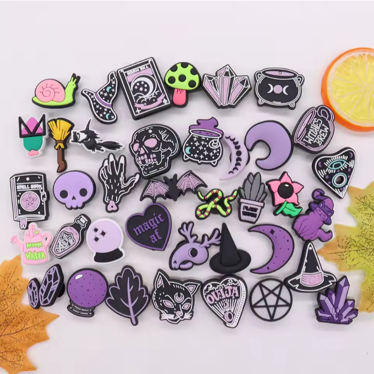 Monte seu kit de 5/10 bottons de bruxa charm pins pingentes para croc babuche - roxo lua gato