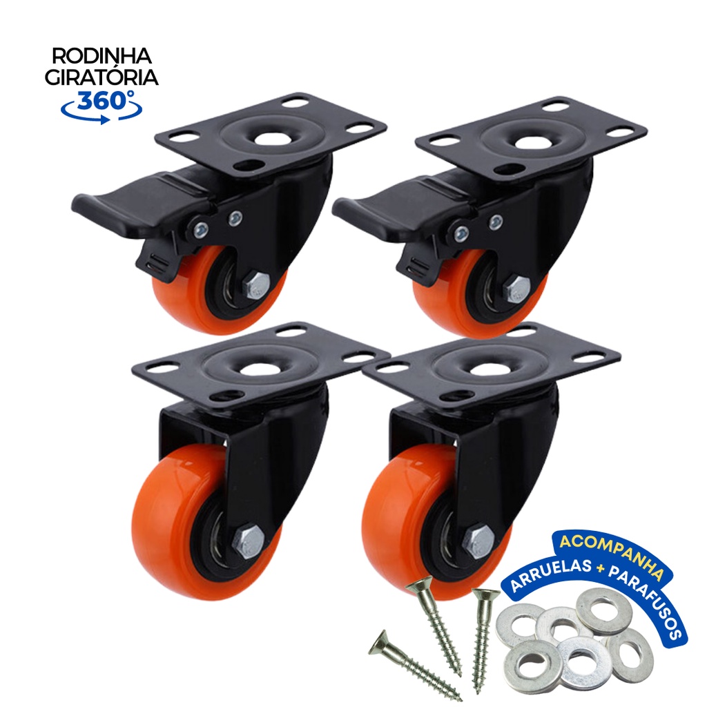 Rodinhas kit 4 Rodízio Anti-risco Giratórias Com Freio e Trava Rodas Super Reforçada 2 Polegadas Cor Preta/Laranja