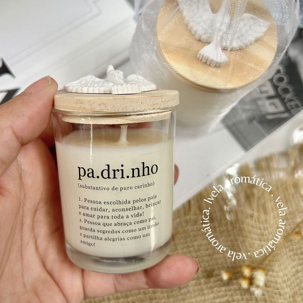 Lembrancinha de Batizado para Padrinhos Vela Aromática + Saco de organza e Divino Espírito Santo