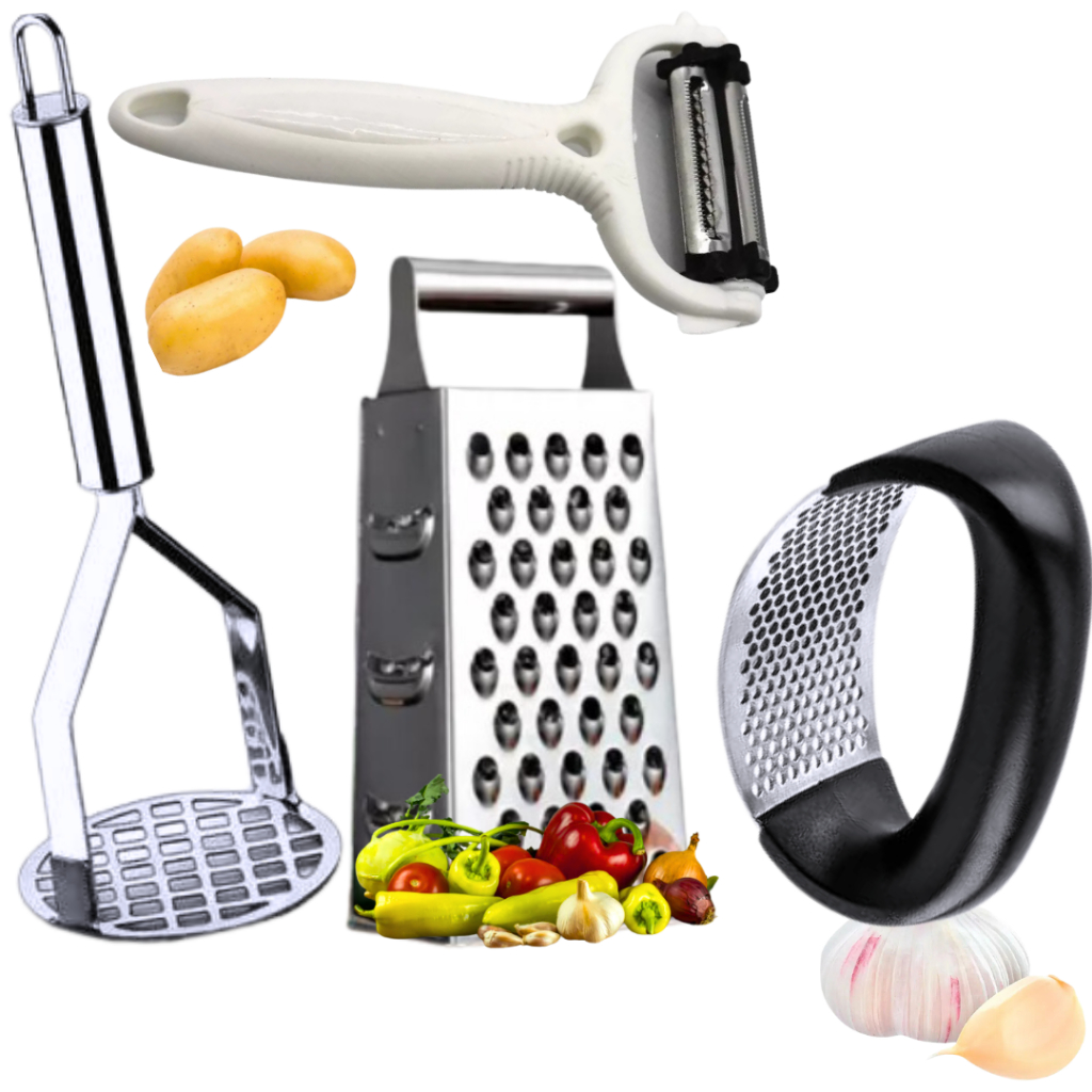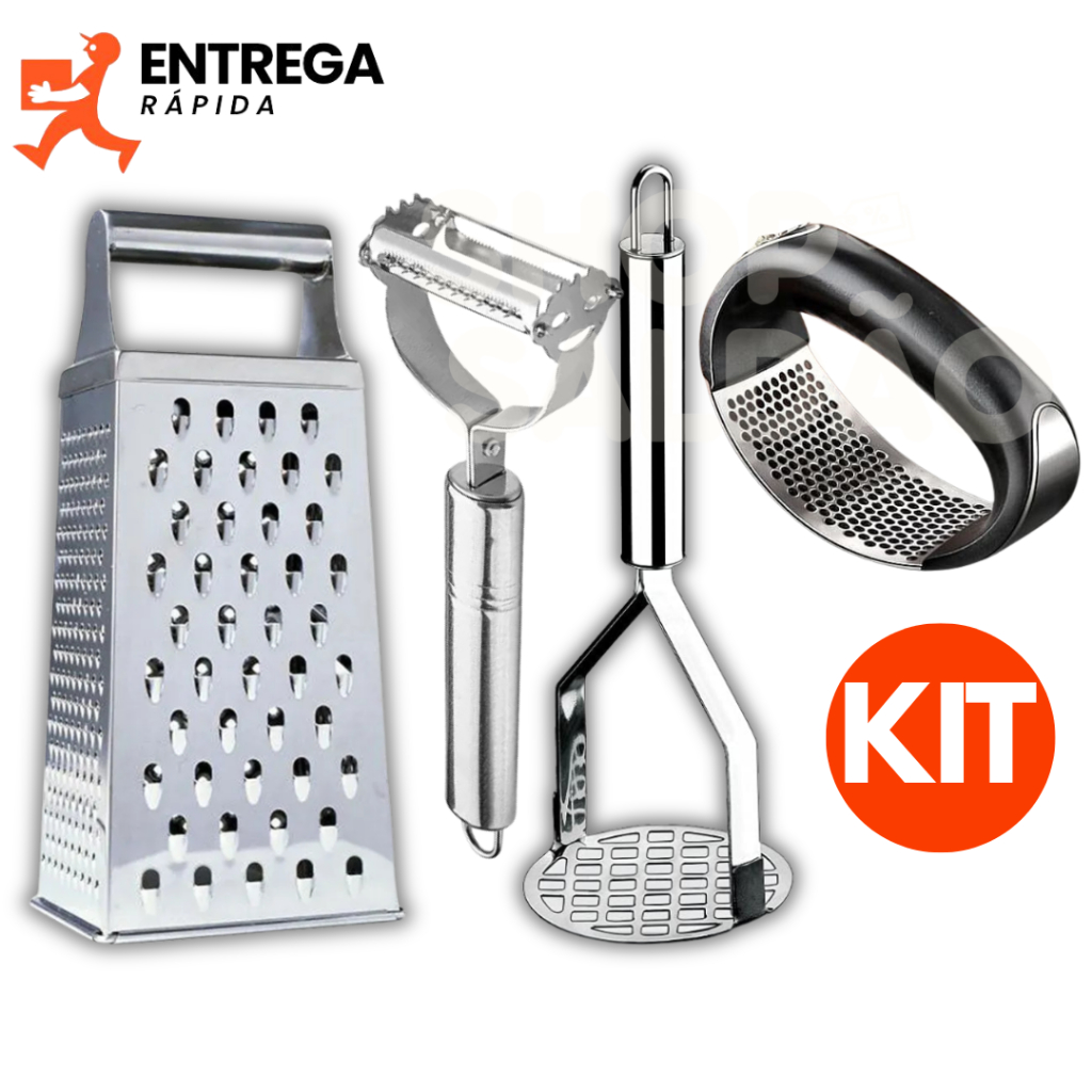 Kit 4 Peças Aço Inox: Descascador, Amassador de Batata, Espremedor de Alho e Ralador 4 Faces Cozinha