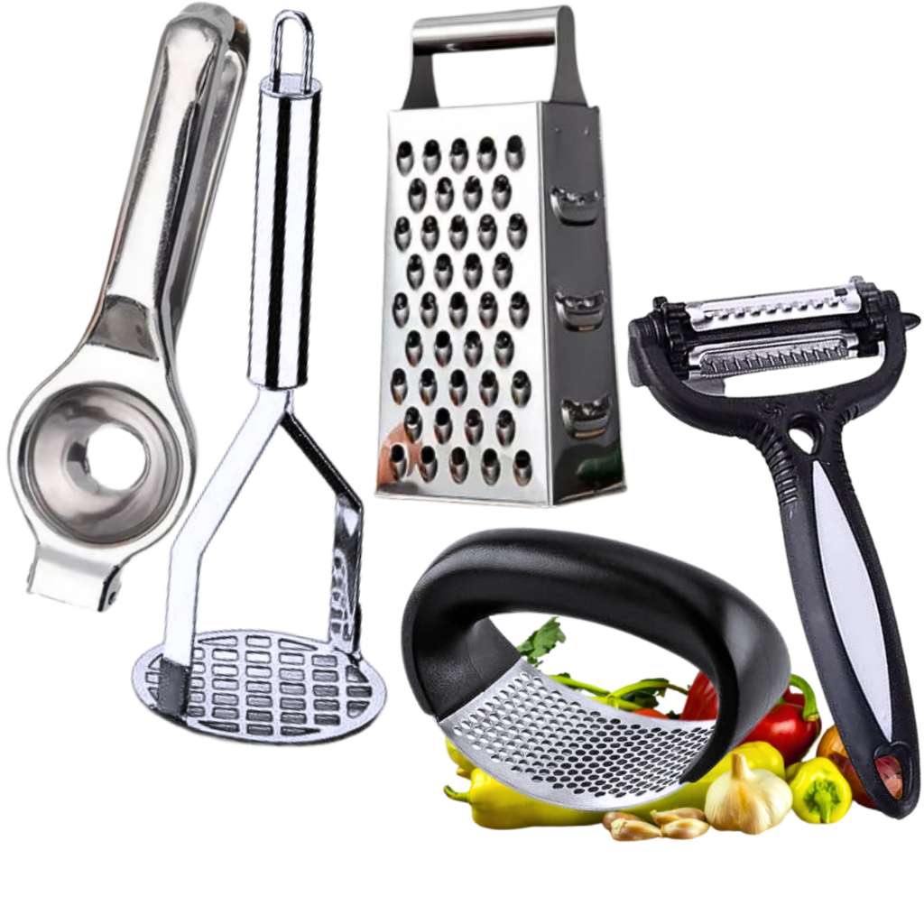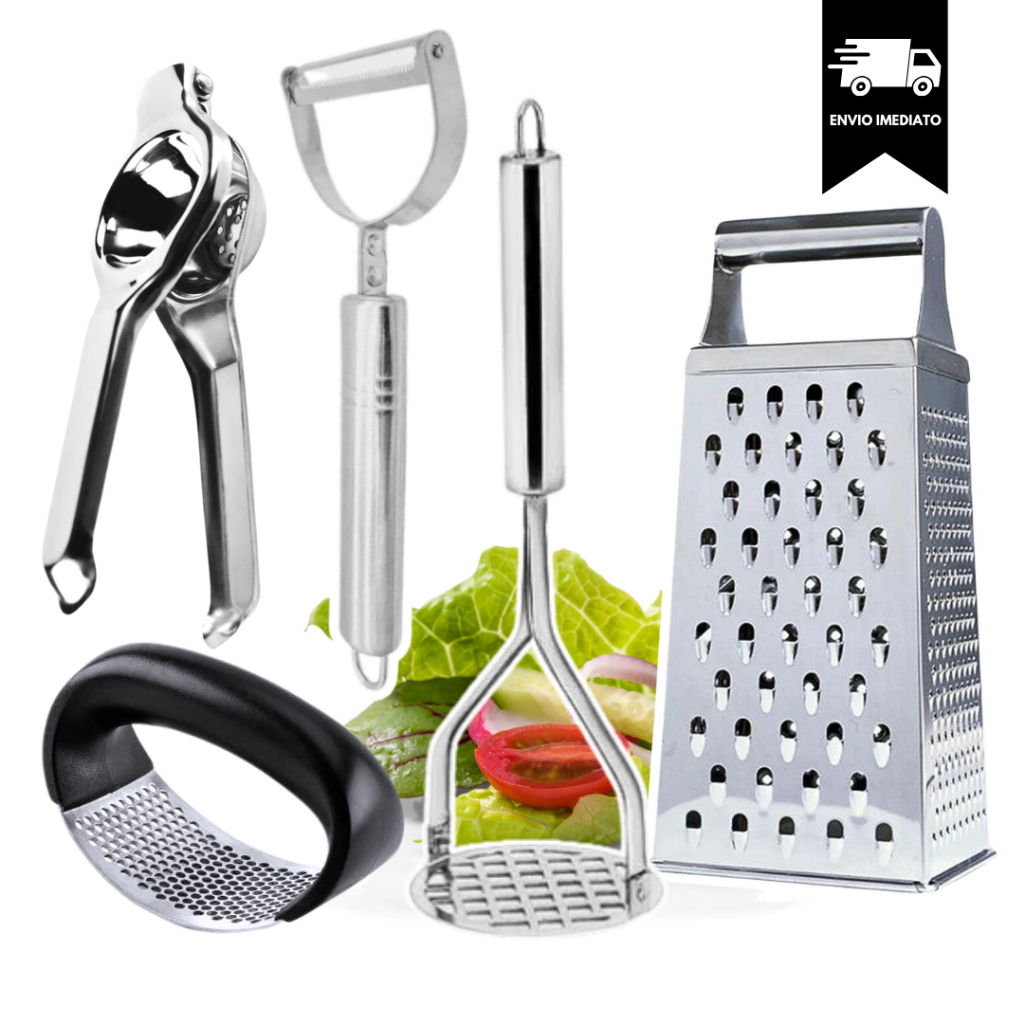 Kit 5 Peças Descascador INOX + Amassador de Batata + Alho + Ralador 4 faces + Espremedor de Limão