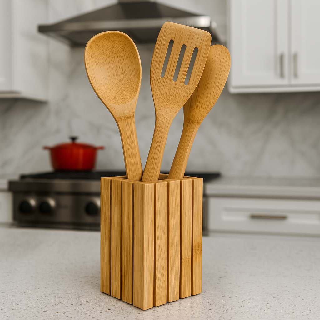 Porta Talheres de Bambu Natural Design Vertical Organizador Cozinha Bancada Sofisticada