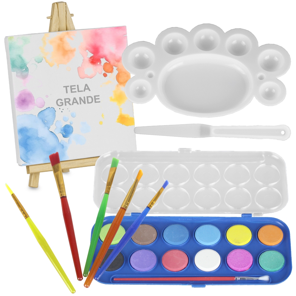Kit Tela de Pintura com Mini Cavalete + Estojo de Aquarela 12 Cores, 6 Pincéis Artísticos e Paleta
