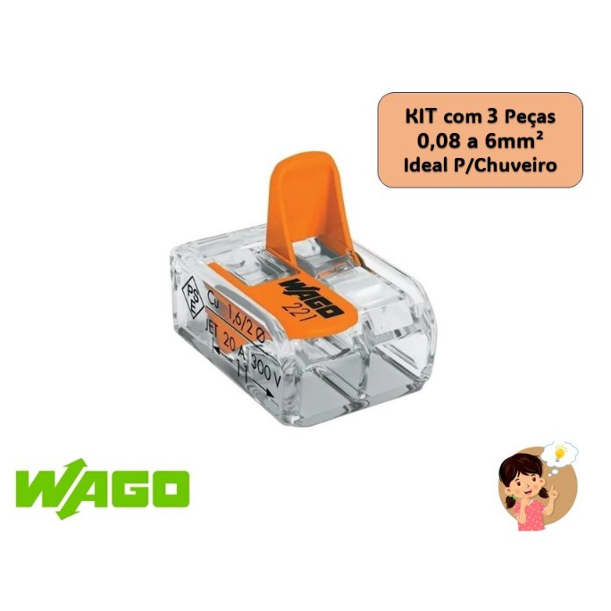 Kit 3pçs Conector Emenda Wago 6mm² Chuveiro 0,08 a 6mm² 41A 221-612 2 vias Original