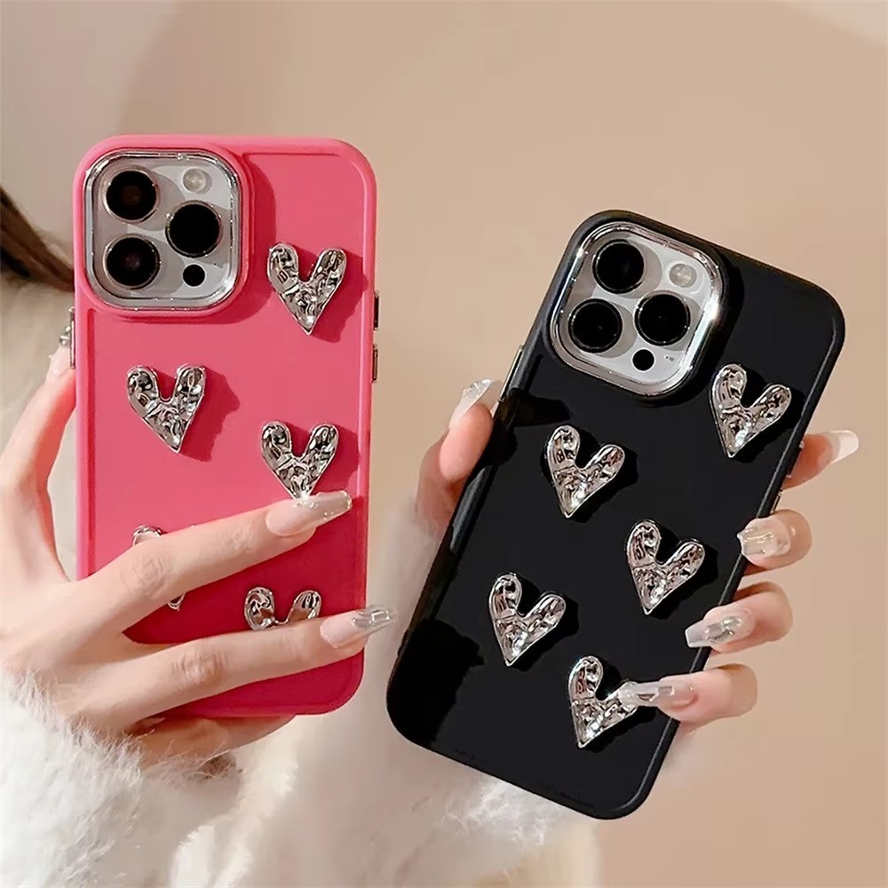 INS 3D Chapeamento Prata Amor Coração Capa De Telefone Para iPhone 11 12 13 14 15 16 Pro Max X XS XR 8 7 Plus SE 2022 Protetora Com Moldura De Lente Banhada A