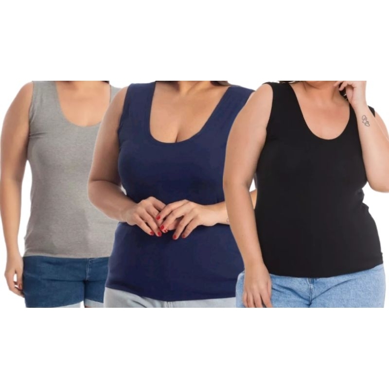 Kit 3 Regatas alça larga feminina Plus Size blusinha básica
