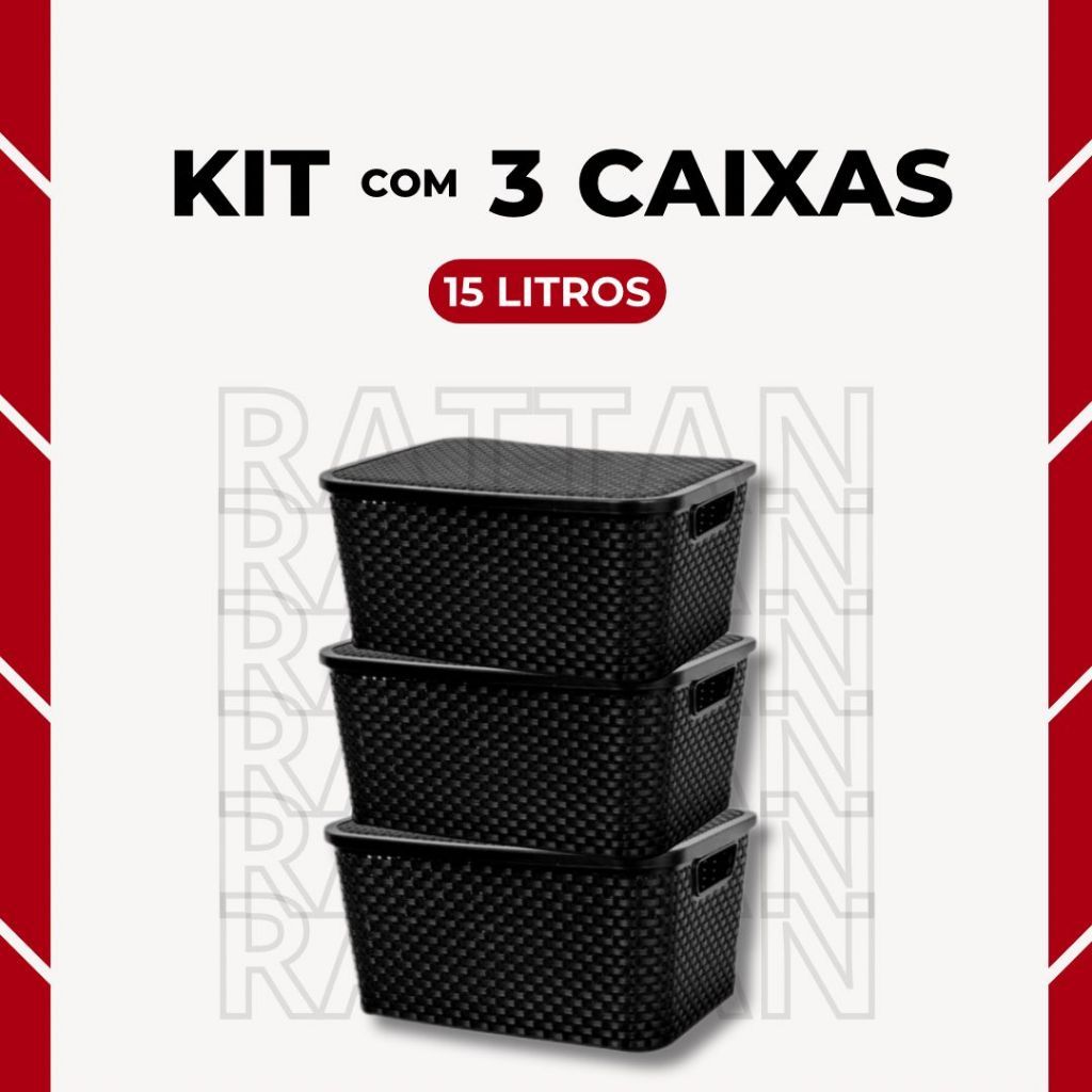 Kit 3 Caixas Organizadoras 20 Litros, 15 Litros e 7 Litros Cesto Multiuso Rattan Com Tampa Preto Empilhavel Brinquedos Roupas Livros Caixa Organizadora