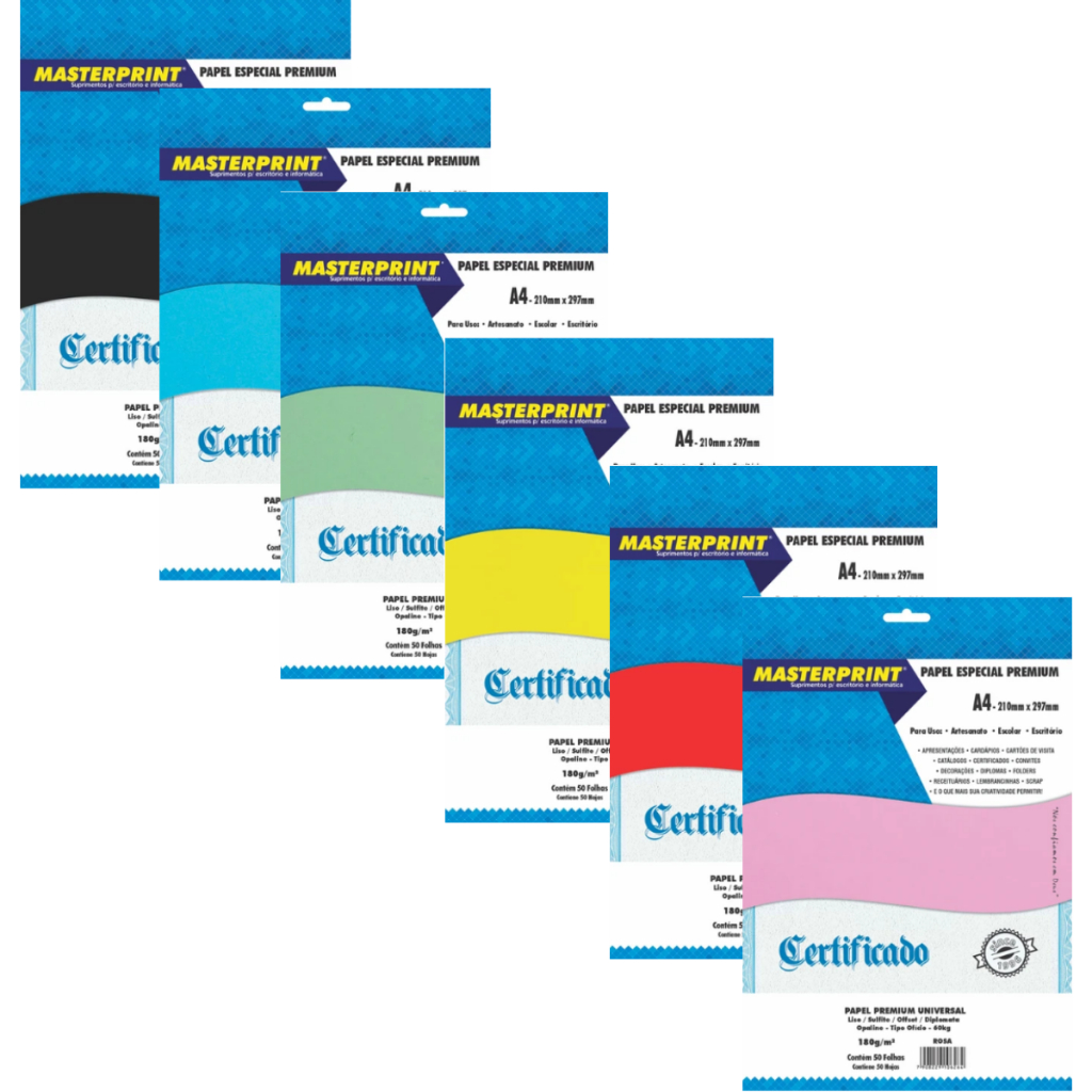 Papel Color Plus 180g A4 50 Folhas Rosa Azul Amarelo Verde Masterprint