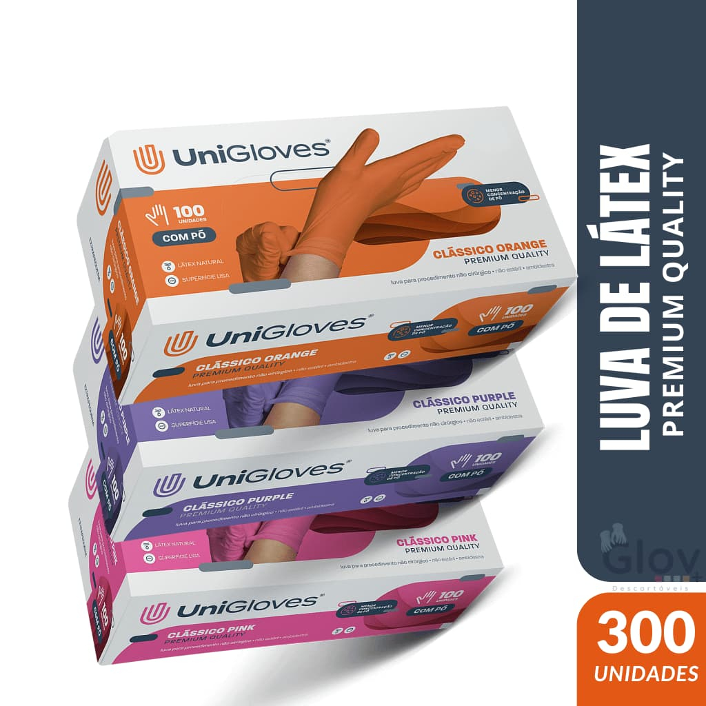 KIT 3 CAIXAS Luva Látex Descartável Com Pó UniGloves 300 Unidades